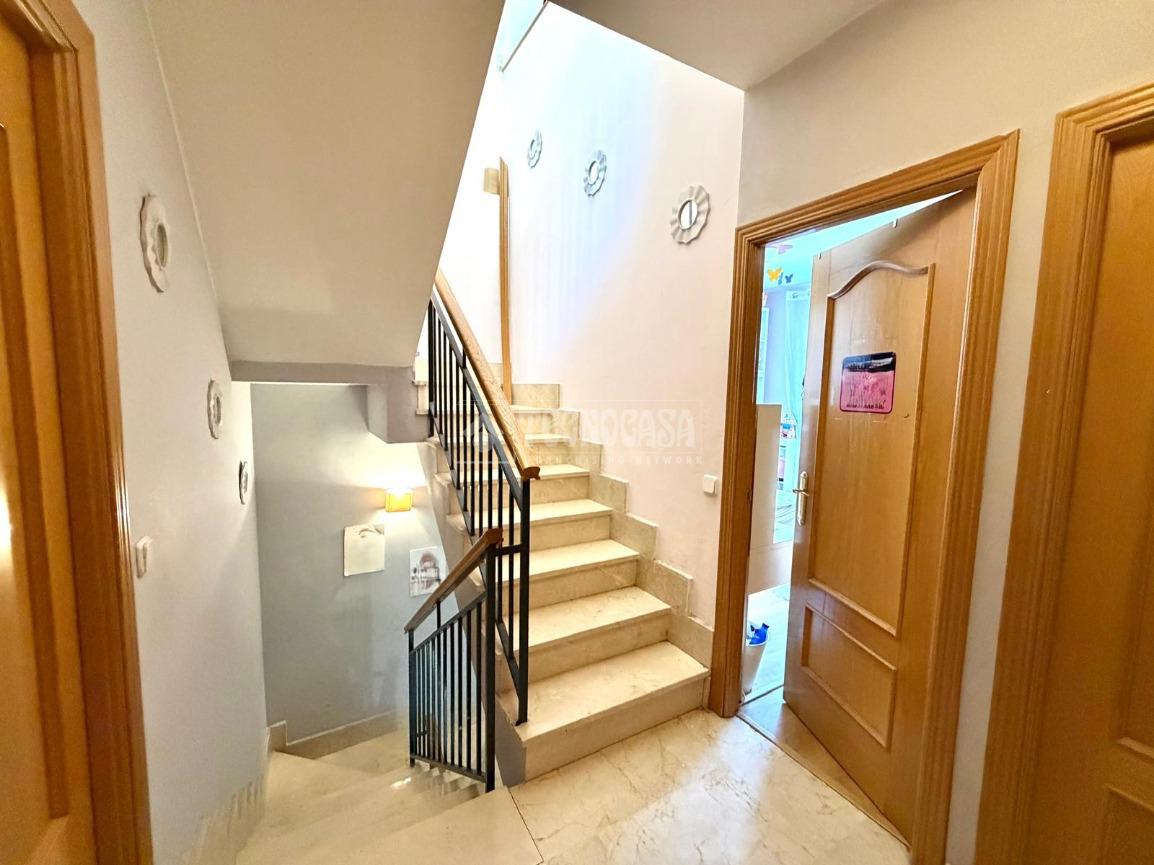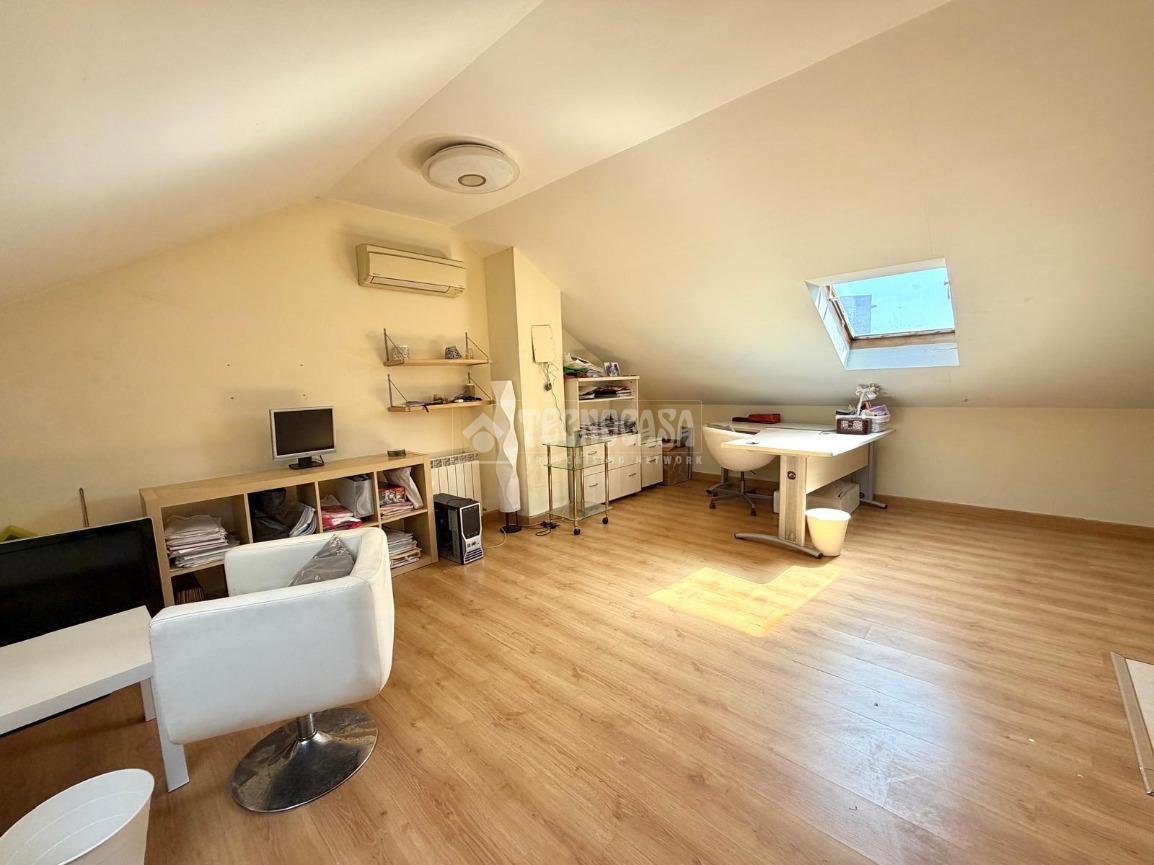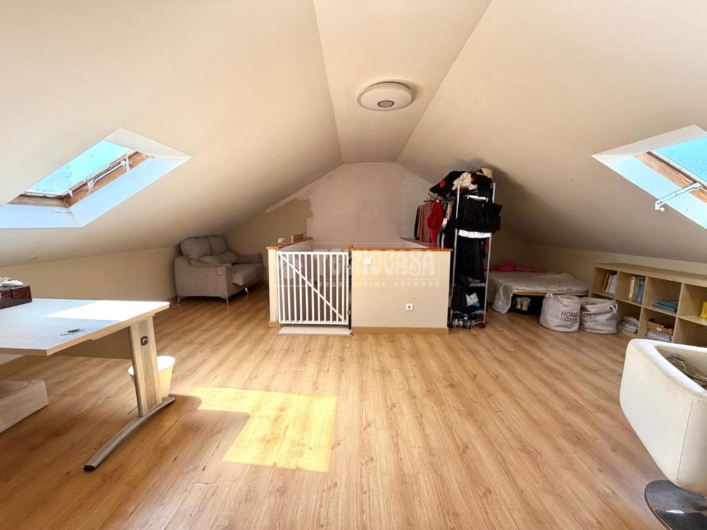 Desde el hall accedemos a la PRIMERA PLANTA: Consta de 3 dormitorios con armarios empotrados. El dormitorio principal tiene acceso a la terraza, cuenta con vestidor y baño con bañera en suite; otro de los dormitorios también tiene acceso a la terraza, y cuenta con otro baño completo con bañera de uso común. Desde el hall accedemos a la SEGUNDA PLANTA donde encontraremos una amplia y luminosa BUHARDILLA con ventanas velux equipada con aire acondicionado frío/calor y radiador, destinada a zona de ocio, despacho o dormitorio adicional.